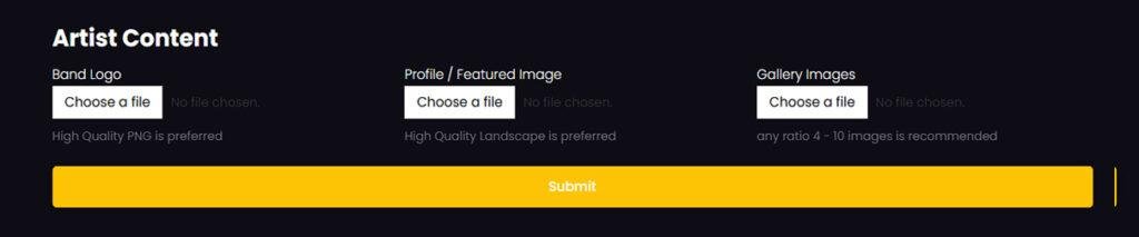 • Gallery (Max 10) – Up to 10 extra images of your band/artist (live shows, press shots, etc.).